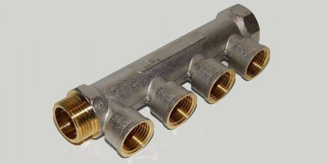 Le collecteur se connecte directement à la colonne montante. Sur les deux côtés opposés de l'appareil, une connexion filetée est fournie (d'un côté un filetage interne, de l'autre - un filetage externe) pour la connexion à la ligne principale et la connexion des peignes les uns aux autres.