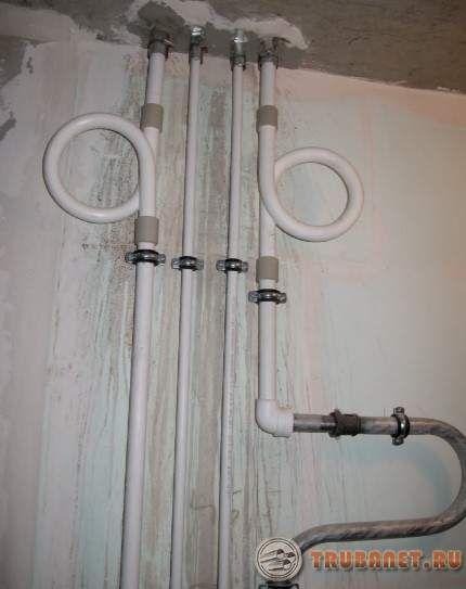 Si plusieurs circuits en polypropylène sont installés en parallèle, il est pris en compte que le diamètre du joint de dilatation est légèrement supérieur au diamètre du tuyau. Dans ce cas, les structures à soufflets sont décalées, et la distance entre les tuyaux n'augmente pas et se fait selon les normes du passeport technique de la conduite de chauffage.