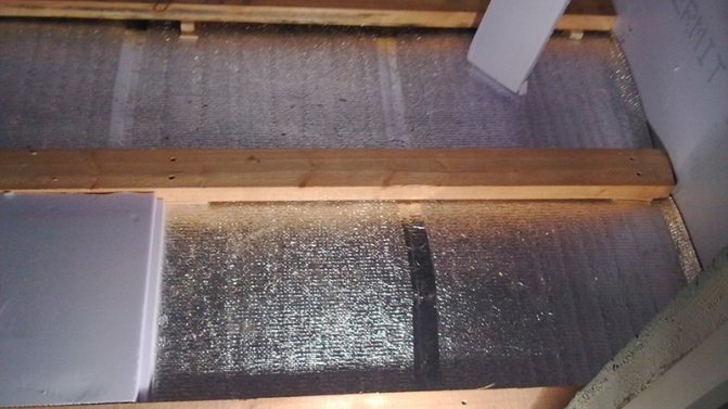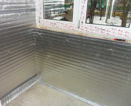 Ensuite, le penofol est posé sur le penoplex. Il servira de pare-vapeur et d'isolation. Il est renforcé avec de la colle ou du ruban adhésif double face. Dans ce cas, le matériau est monté avec une feuille au milieu de la loggia. Ceci est fait pour en réfléchir la chaleur. Le principe ressemble à la technologie de fonctionnement d'un thermos. Pour une plus grande efficacité, nous scellons les coutures avec du ruban métallisé.