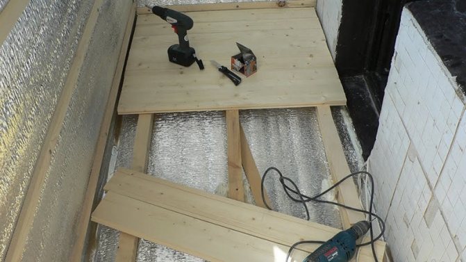 Nous remontons les retards. Ceci est la deuxième couche. Ils doivent être positionnés de manière à ce que leur conception ne coïncide pas avec la première. Cette fois, pour l'isolation, nous mettons penoplex dans les interstices. Nous montons la couche de penofol, à nouveau avec la feuille sur le dessus, et la fixons avec du ruban métallisé. Mettez le panneau de particules sur le dessus. Si vous prévoyez de chauffer la loggia avec des sols chauds, vous n'avez pas besoin de monter la deuxième couche de la bûche. Il sera remplacé par une construction de plancher chaud.