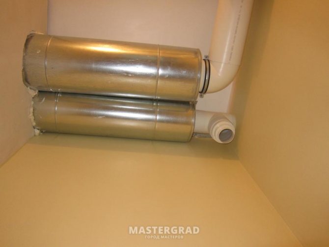 De plus, nous installerons un petit silencieux et une valve à iris pour réguler le débit dans les toilettes. Sans ajustement, le tirage était tel qu'il était impossible de s'asseoir sur les toilettes en hiver - il se dégonfle. Après l'iris, j'ai mis un clapet anti-retour.
