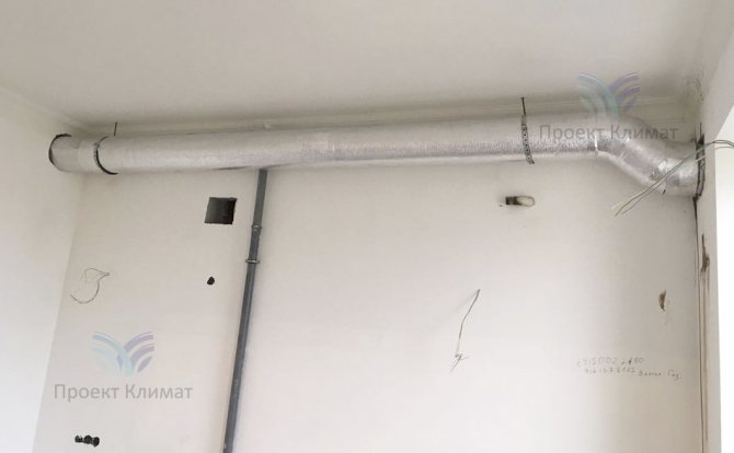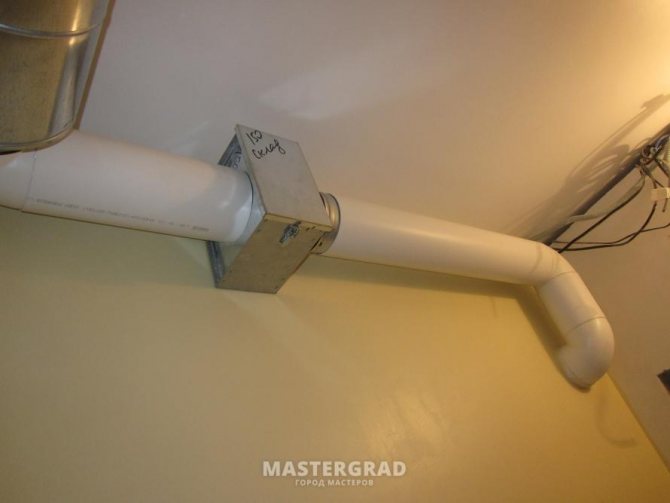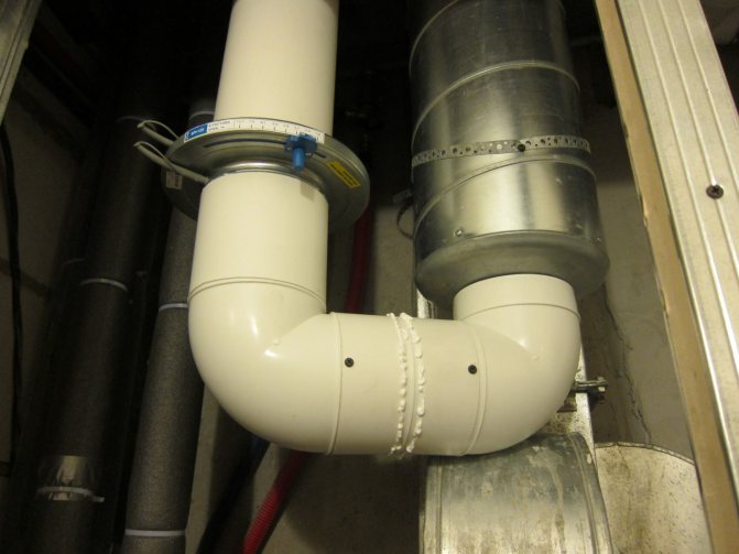 En parallèle, j'ai assemblé un échappement naturel de la cuisine avec un tuyau 125, également avec un clapet anti-retour, qui est à ressort à l'état ouvert (lorsque le ventilateur d'extraction est allumé, le clapet anti-retour se ferme). J'ai fait une branche de la hotte naturelle dans le garde-manger et j'ai réduit la section transversale.