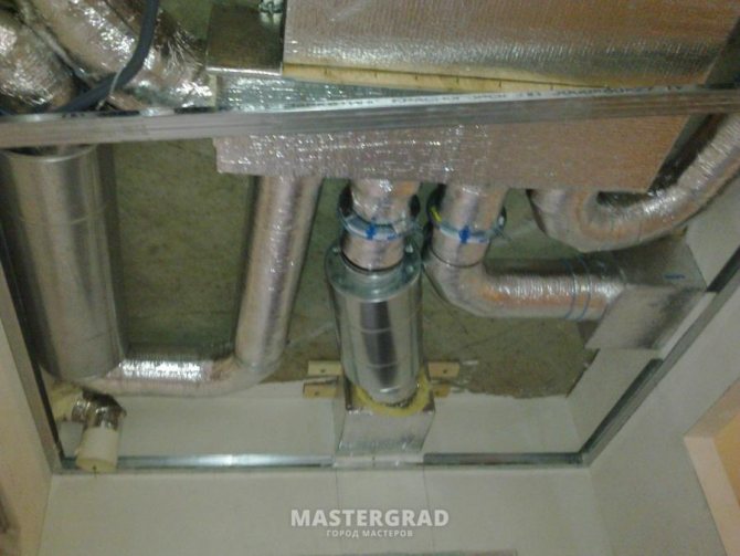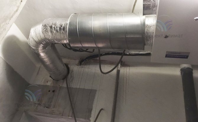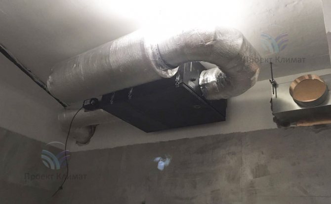 La deuxième option assez courante est puissante climatiseur gainable avec adjuvant d'air frais avec une distribution de conduits d'air pour plusieurs pièces. De plus, seules les grilles d'alimentation et d'échappement sont visibles à l'intérieur. Pas de blocs muraux - tout est caché derrière un faux plafond, derrière de faux murs ou dans de fausses poutres. L'unité de conduit est montée dans un endroit tel que le moins de bruit possible en provenance de celui-ci pénètre dans la pièce. Le bruit peut passer à travers les conduits avec le flux d'air, et également se propager à partir du corps de l'unité de conduit lui-même. Le plus souvent, il s'agit d'une salle de bain, où un plafond suspendu en rack pliable ou une trappe de service pour l'entretien de l'unité et le nettoyage du filtre est réalisé facilement.