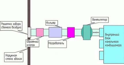 Un système divisé avec une unité intérieure murale fonctionne en utilisant un mélange d'air de la rue. Mais en même temps, l'unité externe du climatiseur est modifiée, un ventilateur et une chambre de mélange sont utilisés. Une unité de préparation d'air est installée à côté du périmètre, fournissant un chauffage hivernal et un maillage grossier pour les débris et les créatures vivantes.