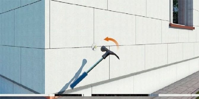 Le profil de départ doit être fixé à une hauteur de 40 à 60 cm du niveau du sol sur tout le périmètre de la structure. Le profil est fixé à l'ancre à raison de 3 attaches par mètre linéaire. Il est nécessaire de laisser un espace de 3-4 mm entre les profils adjacents. en cas de dilatation thermique.