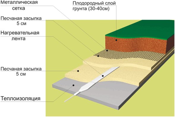 Les radiateurs à bande sont également utilisés dans les serres, car la création de la température et de l'humidité de l'air requises n'est pas suffisante pour la culture de cultures thermophiles - le chauffage du sol est nécessaire. Dans ce cas, le système de chauffage est disposé sur un sous-sol spécialement préparé - une couche d'isolation thermique, au-dessus de laquelle un remplissage de sable est effectué et nivelé horizontalement. Une couche de sable est répétée sur le ruban chauffant posé, puis la base est recouverte d'un treillis d'acier de renforcement et d'une couche de sol fertile. Dans ce cas, la pose d'un ruban résistif est également peu pratique - un ruban autorégulant est nécessaire.