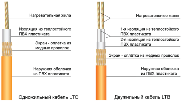 Un câble à deux conducteurs se compose d'un noyau chauffant et d'un noyau conducteur, les courants dans lesquels circulent dans des directions différentes - les facteurs négatifs des champs magnétiques des fils se compensent (un câble à deux conducteurs est connecté au réseau d'une extrémité , un manchon spécial est installé à l'autre extrémité);