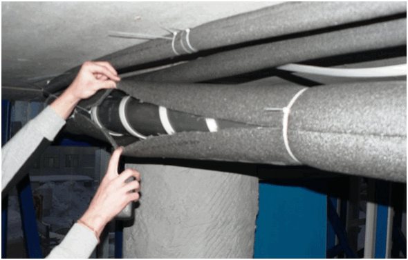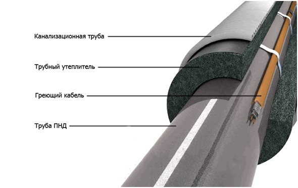 Le système d'égouts des bâtiments privés a également besoin d'être protégé du gel, mais un chauffage excessif de l'autoroute est inutile ici. Par conséquent, les tuyaux d'égout sont équipés de rubans chauffants situés linéairement sur le système et une couche d'isolation thermique avec un boîtier de protection est montée au-dessus de l'égout.