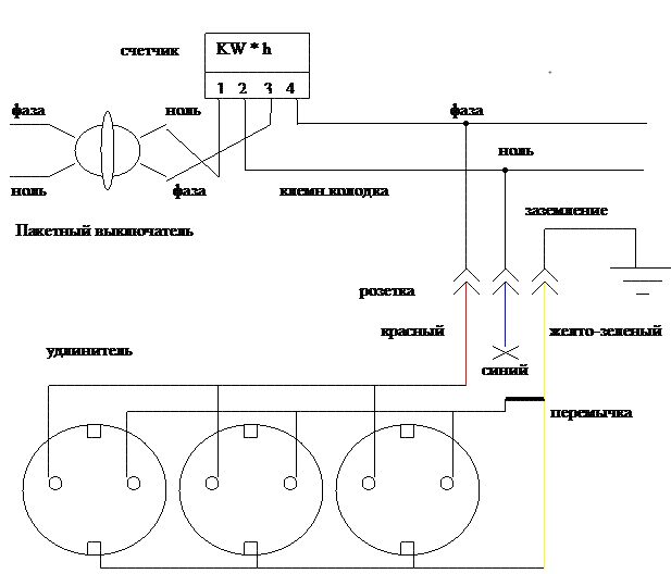 Toutes les prises de l'appartement doivent être correctement mises à la terre. Pour que le compteur ne «bobine» pas les kilowatts de la prise, une rallonge est achetée pour cela, dans laquelle les prises sont également mises à la terre. Le fil neutre bleu doit être retiré et isolé d'eux.
