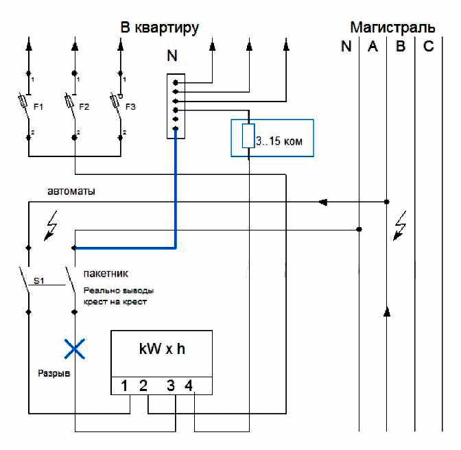 Seule une phase est connectée au dispositif de surveillance. Le fil zéro se casse à l'intérieur de l'isolant (croix bleue sur le schéma). Pour exclure complètement sa reconnexion, l'isolant au point de rupture est étiré et de la colle est versée dans l'espace entre les joints à l'aide d'une seringue.