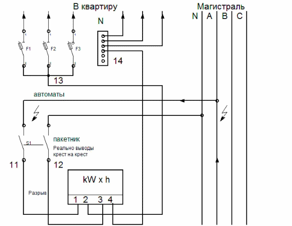 Le zéro N est fourni à la première borne du compteur électrique et le fil de phase A est connecté à la troisième Pour ce faire, transférez les fils 11 et 12 à la sortie de l'interrupteur principal (voir la figure ci-dessous). Dans ce cas, l'opération de comptage ne changera pas.