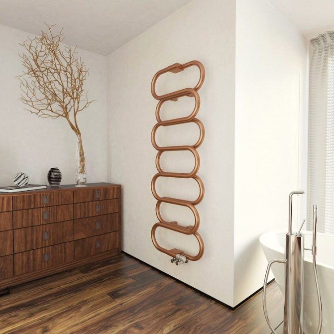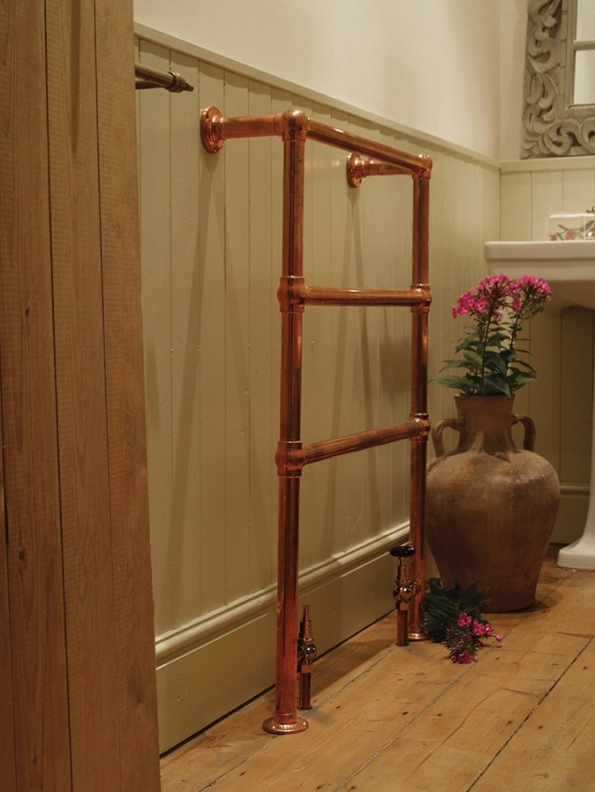 Il est courant de séparer les radiateurs pour chauffer les salles de bains en un groupe séparé. En règle générale, ils combinent les fonctions de sécheuses pour petits vêtements et se composent de plusieurs tubes. En raison de leur résistance aux processus corrosifs, y compris l'électrocorrosion, les sèche-serviettes en cuivre conviennent pour une installation dans des systèmes de chauffage central et d'eau chaude.