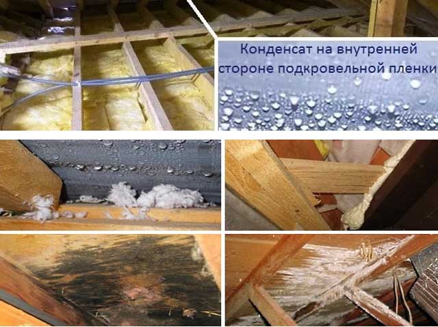 La condensation sur le toit endommage gravement une variété de matériaux isolants tels que la laine minérale. De l'humidité, il se transforme non seulement en grumeaux, mais perd également ses propriétés. Le coton humide ne durera pas plus de deux ans, bien que dans des conditions sèches, il ne sera pas nécessaire de le changer après 20 ans.