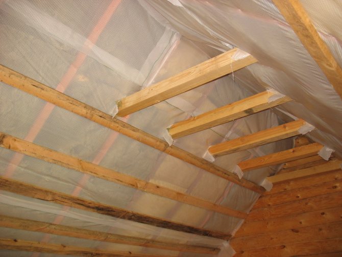 - Un lattage constitué de poutres en bois est monté sur les murs porteurs. Il doit correspondre à la hauteur de l'espace intérieur.