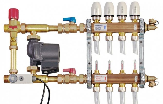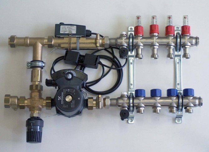 Si pour un chauffage ordinaire avec des piles, une température de 80 à 90 degrés est nécessaire, pour le chauffage au sol, elle doit être inférieure, de 30 à 40 degrés, afin qu'il soit confortable de marcher sur le sol sans risque de brûlure. C'est à l'aide d'une unité de mélange pour sol chaud que des conditions favorables peuvent être obtenues pour le fonctionnement complet des éléments chauffants invisibles.