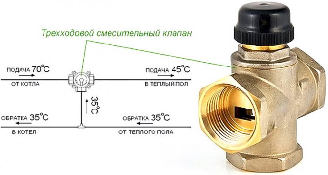 Le travail du type n ° 1 est basé sur une vanne à trois voies pour un plancher chaud, dont la tâche est de combiner une nouvelle source de chaleur d'une chaudière de chauffage avec une chauffée refroidie.