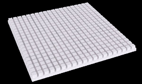 Tapis rectangulaire en mousse de polystyrène expansé très haute densité... Épaisseur du substrat de 10 mm à 35 mm. Les pattes sont des cylindres ou des cubes de 20 à 25 mm de hauteur. Des tuyaux d'un diamètre de 14 mm à 20 mm sont posés entre les cosses. Les saillies servent de verrou fiable lors du coulage du mortier. Le risque de déplacement des tuyaux est nul.
