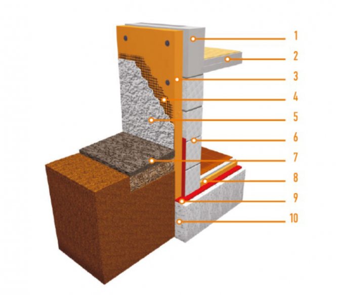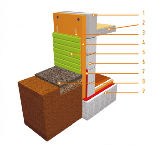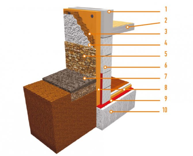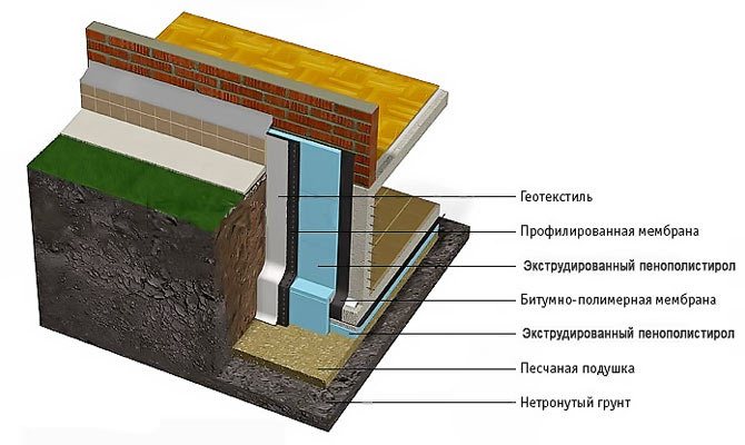 - disposition de l'isolation verticale à la hauteur du sous-sol et isolation du sous-sol (protection contre l'eau dans le sol) ;