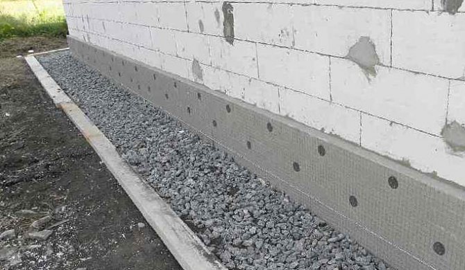 Avant d'isoler directement, un système de drainage est installé autour de la maison pour éliminer l'excès d'humidité. Pour ce faire, une tranchée est arrachée autour de la base de la fondation, au fond de laquelle du sable est versé, des tuyaux en plastique sont posés dessus, puis tout est recouvert de terre. La tranchée doit descendre dans le réservoir de collecte d'eau. Pour se protéger des écoulements d'eau du toit, une zone aveugle en béton est aménagée autour de la maison. Vous pouvez maintenant isoler les murs extérieurs du sous-sol.