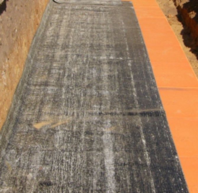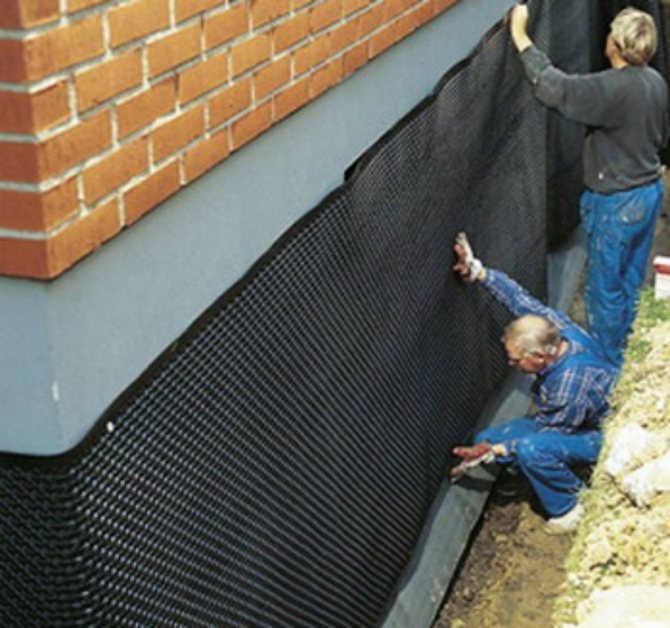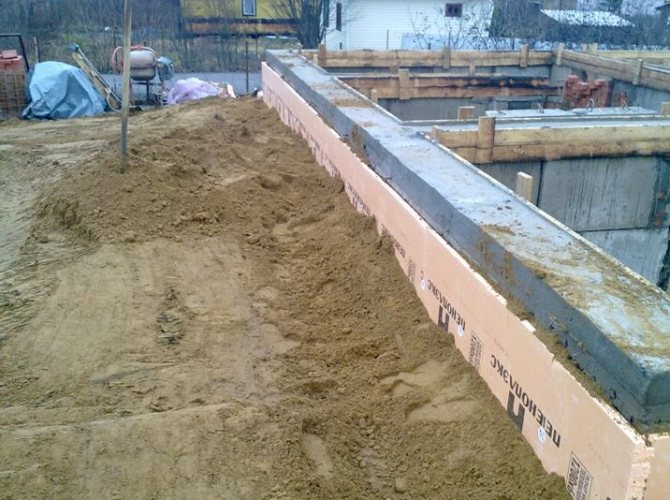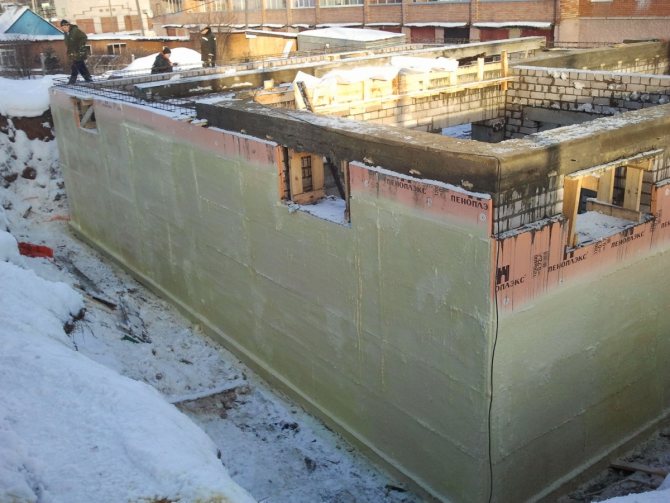 À l'étape suivante, l'imperméabilisation est effectuée. Tout d'abord, un mastic à base de bitume est appliqué, puis des feuilles chauffées de techno-nicol sont posées avec un chevauchement, les joints formés sont traités avec du mastic. Après cela, la partie du sous-sol qui est en contact avec le sol est remplie d'une solution à base de ciment, d'argile expansée et de sable, et la partie aérienne est isolée directement avec du penoplex.