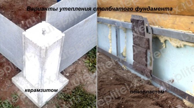 Les piliers de la fondation sont gainés autour du périmètre avec des barres de bois, des planches ou un profilé sur toute la hauteur (voir photo ci-dessus). Une base de support est nécessaire lors de l'isolation d'une fondation colonnaire avec de la laine minérale et du polystyrène expansé. Nous recommandons d'utiliser du polystyrène expansé, car la structure est adjacente au sol et sera constamment exposée à l'humidité du sol et aux précipitations.