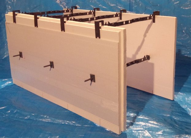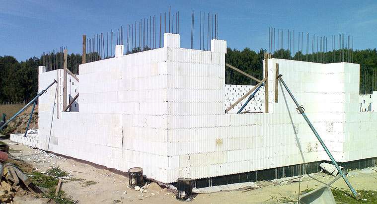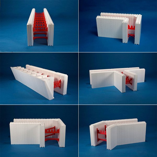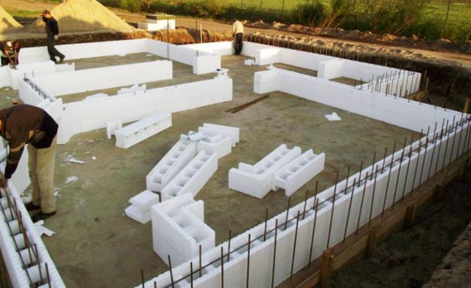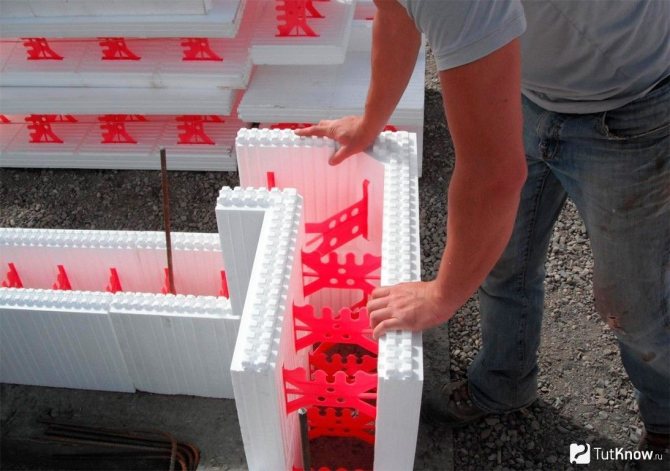 Une fois la couche de nivellement solidifiée, le coffrage de la fondation est en polystyrène expansé. Les blocs de polystyrène sont montés sur des barres d'armature dépassant du fond de la tranchée. Les blocs sont reliés les uns aux autres par le type «rainure-peigne», ainsi que par des équerres supplémentaires. Verticalement, les blocs sont disposés de la même manière avec un pansement, au fur et à mesure que les briques sont posées. Ainsi, les coutures verticales se chevauchent. Aux coins, les blocs sont coupés en deux. Ils sont faciles à couper à la main. Les constructeurs utilisent des machines spéciales pour cela lorsqu'une productivité élevée est requise.
