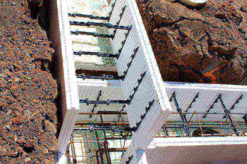 La technologie des murs en blocs préfabriqués ne convient pas à une utilisation dans la construction de fondations. Après avoir posé 4 à 5 rangées de blocs, le coffrage du mur est coulé avec du mortier de béton, un "squelette" en béton est obtenu, pénétré d'éléments en mousse. Dans ce cas, la structure du mur en béton ajouré recouverte de polystyrène expansé est trop faible pour supporter le poids du bâtiment de 100 tonnes. La fondation reste la fondation, elle doit être solide et rigide.Par conséquent, que le coffrage en bois ou en mousse soit utilisé, la structure du système de fondation doit être monolithique et lourde.