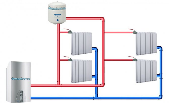 - Deux tuyaux - le schéma de câblage le plus courant, impliquant la pose de deux circuits de tuyauterie, pour le retour et l'alimentation. Il est utilisé à la fois pour la circulation forcée et naturelle.Malgré la consommation accrue de matériaux, un tel système fonctionnera plus efficacement. Il permet un chauffage plus uniforme des radiateurs. Faites attention! Le respect des pentes est d'une importance particulière. Cette disposition est recommandée pour les maisons de grande superficie.