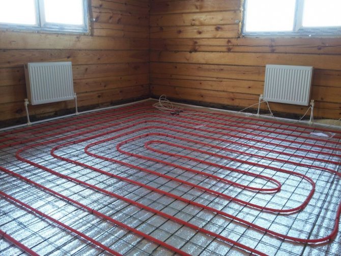 Il est un peu plus difficile d'organiser le chauffage de l'eau avec des sols chauds et coûtera plus cher. Les tuyaux avec le fluide caloporteur sont posés sous le revêtement de sol dans toutes les pièces, convergeant vers un collecteur de distribution. Ici, vous ne pouvez pas vous passer d'électricité, l'eau des circuits de chauffage par le sol ne coulera pas d'elle-même, une pompe de circulation est absolument nécessaire.