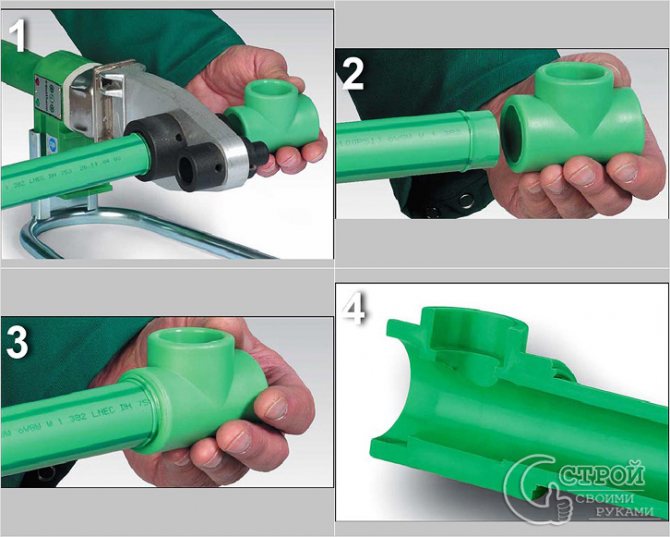 - L'étape suivante du soudage des tuyaux comprend le réchauffage du fer à souder, mais seulement maintenant une pièce avec un raccord est placée sur la buse, et la partie libre de la communication est insérée dans un autre trou;