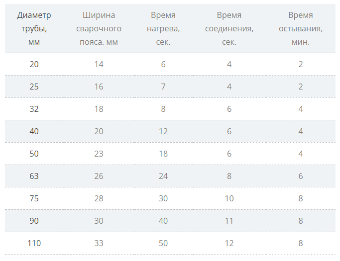 IMPORTANT! Les données de synchronisation pour différents matériaux peuvent varier en fonction de la pureté du matériau du tuyau, de la présence de renfort et d'autres aspects, jusqu'à la température ambiante. Mais ces écarts ne sont clairement visibles que sur des tuyaux de grand diamètre. Pour les petites dimensions, le temps différera de 1 à 1,5 s au maximum. Si quelque chose ne fonctionne pas pour vous ou si vous le faites pour la première fois, vous pouvez acheter certains des raccords les plus simples (raccords), couper des tuyaux (plusieurs morceaux de 7 ... 10 cm) et vérifier comment le le matériau réagit au chauffage et à la connexion.