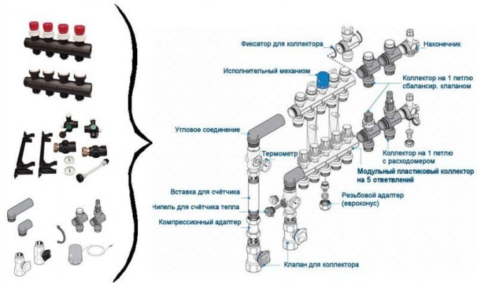 Pour le chauffage par le sol, la canalisation est reliée à un collecteur. L'équipement a des sorties pour le liquide de refroidissement chaud et pour le liquide réfrigéré qui est pompé dans la chaudière. Le nombre de sorties dans le collecteur correspond au nombre de circuits de chauffage de l'eau. Un liquide de refroidissement d'une certaine température est fourni à la ligne. Les servos sont conçus pour le réguler au moyen de vannes situées sur le collecteur.