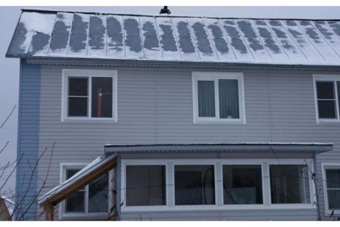 - La neige qui s'accumule sous le faîte du toit fond progressivement et coule le long des murs. Si un matériau d'étanchéité est installé, l'humidité le traverse jusqu'à la zone de fondation, puis vers le système de drainage.