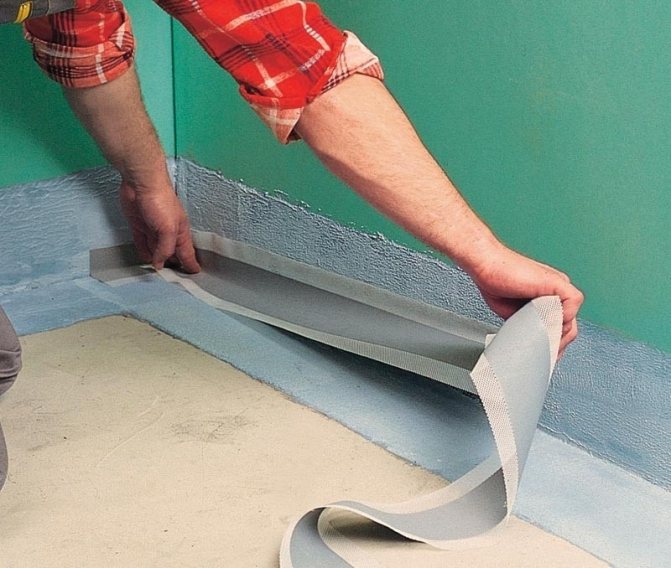 Je commence à appliquer le mastic en traitant les endroits où l'eau est le plus susceptible de s'écouler - les joints du sol et des murs, les sorties de tuyaux, les drains. Après cela, tous les joints sont fermés avec un ruban d'étanchéité. Les irrégularités et les bulles d'air sous la ceinture ne sont pas autorisées. Si la largeur du ruban n'est pas suffisante pour chevaucher le pilier, il est permis de chevaucher le ruban avec un chevauchement d'au moins 5 cm et de traiter le joint avec du mastic. Un signe de travail de haute qualité est considéré comme l'étanchéité, y compris les coins des murs jusqu'à une hauteur de 20 cm du sol. Après avoir collé le ruban, une autre couche de mastic est appliquée.