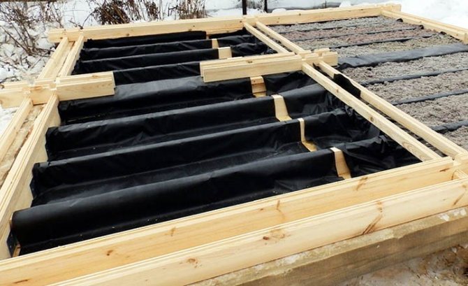 L'imperméabilisation doit être appliquée directement sur le cadre de support du sous-plancher. Attention : le film doit être superposé. Pour fixer les bords du film, il est rationnel d'utiliser une agrafeuse de construction ou des clous galvanisés ordinaires. Les fabricants recommandent d'utiliser un ruban spécial pour fixer les bords. Le film permet d'obtenir une couche parfaitement homogène sans fissures ni interstices.