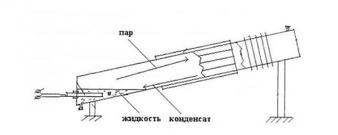 Pour assembler un appareil de chauffage à gouttes de vapeur, vous aurez besoin d'un broyeur et d'une machine à souder. Coupez le tuyau principal (nous utiliserons un tuyau), réglez-le à un angle donné. Nous alignons la partie inférieure verticalement et la soudons - l'élément chauffant coupera ici. Nous soudons également la partie supérieure, mais n'oubliez pas de souder un tube avec un robinet à boisseau sphérique. Et il est préférable d'avoir deux robinets - par un, de l'eau sera versée, et par le second, l'air déplacé par elle sortira.