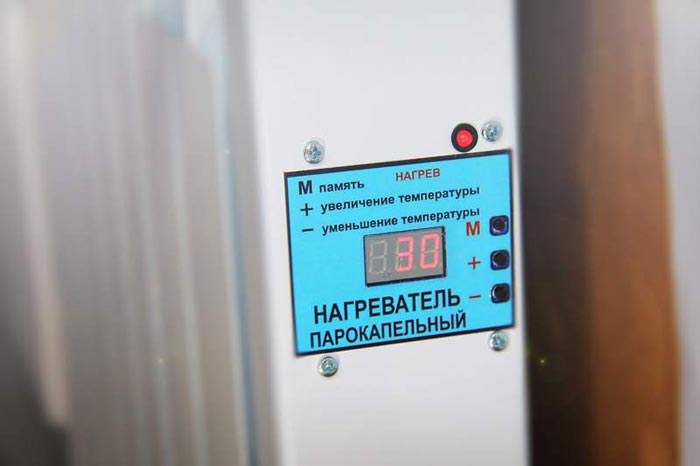 Considérez le dispositif d'un réchauffeur de gouttelettes de vapeur. Son élément principal est un élément chauffant, qui chauffe l'eau distillée dans un tuyau fermé. Le régime de température est surveillé par un thermostat électronique. La température préréglée y est réglée, après quoi la pièce commence à se réchauffer. Le principe de fonctionnement d'un réchauffeur à goutte de vapeur est le suivant: