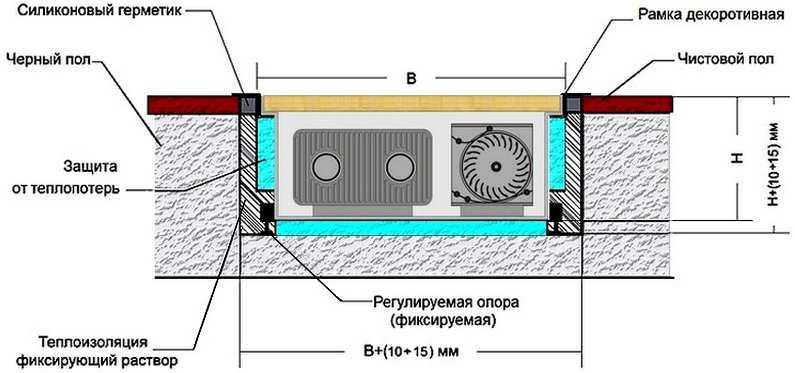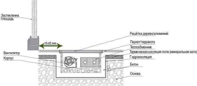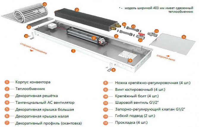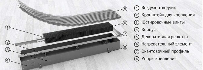 À proprement parler, il n'y a que trois parties principales du convecteur de sol: un corps, un élément chauffant avec nervures et une grille de protection décorative. Pour une dissipation thermique plus efficace, un ventilateur est intégré - c'est la quatrième partie. Les ventilateurs fonctionnent généralement en sous-tension - 24 V ou 12 V, de sorte qu'un transformateur abaisseur est nécessaire pour fonctionner. Faites attention à cela. Dans la plupart des cas, il va "intégré" au boîtier, mais il y a ceux qui doivent avoir un convertisseur de tension externe et auxquels une tension déjà réduite doit être fournie.