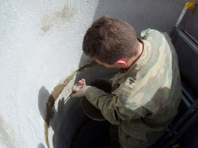 Le processus de scellement des joints entre les anneaux avec un mélange de ciment à prise rapide