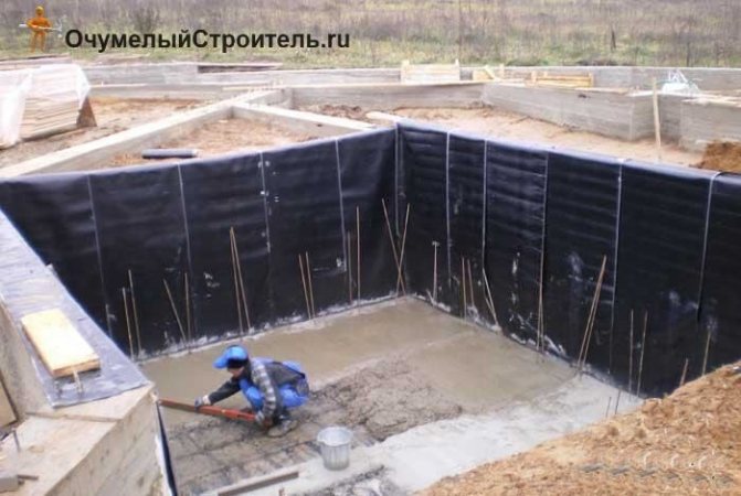 Lorsque la fosse du garage est prête, les murs et le fond de la future cave sont alignés. Le fond de la fosse dans le garage est bien percuté; à ces fins, le moyen le plus simple est d'utiliser un pilon électrique ou à essence. Il est nécessaire d'y faire un remblai de sable avec une couche de 10 cm, puis un remplissage est fait à partir de pierre concassée de la fraction médiane. L'épaisseur de la couche doit être d'environ 10 cm et doit également être bien nivelée. Ensuite, la future fondation est imperméabilisée. À ces fins, vous pouvez utiliser des matériaux de toiture. Ses feuilles doivent être posées avec un chevauchement de 10 cm Dans ce cas, il est préférable de coller les joints avec du mastic bitumineux. Une telle couche constituera une excellente barrière contre l'humidité. Le matériau de toiture doit être posé avec un chevauchement sur les murs.