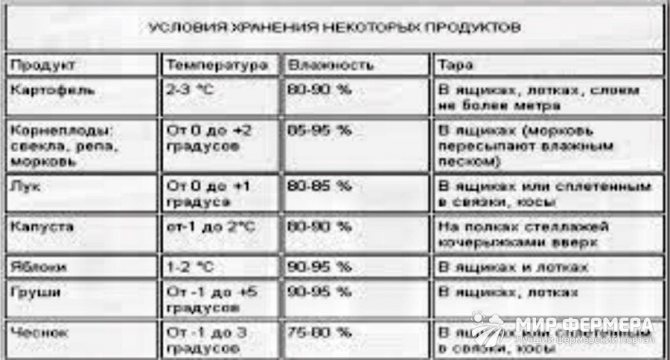 La température optimale pour la conservation des légumes est considérée comme égale à zéro degré, mais lors de la pose de produits au sous-sol, il faut garder à l'esprit que chaque type de légumes et de fruits nécessite ses propres conditions de température et d'humidité (tableau 1).