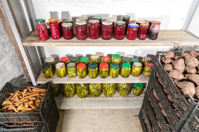 Si la cave est faite correctement: en utilisant des matériaux thermiques et imperméables, avec une ventilation forcée ou naturelle installée, avec la construction d'étagères spéciales pour stocker les aliments, elle peut être conservée en bon état jusqu'à la fin du printemps sous forme de flans en conserve dans des bocaux et autres contenants et légumes frais: carottes, pommes de terre, betteraves, choux, etc.