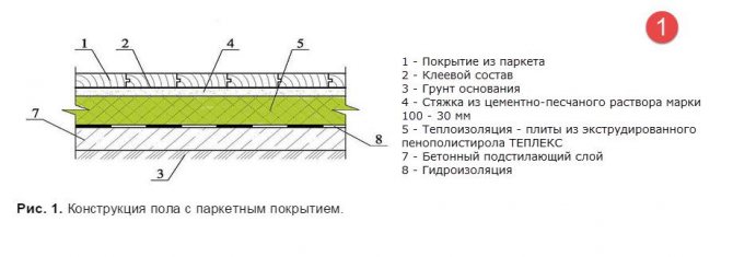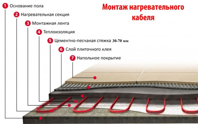 - Chape de ciment - une couche de béton - recouvrant les tuyaux, d'une épaisseur totale d'environ 60 mm (au-dessus du tuyau - 40 mm)