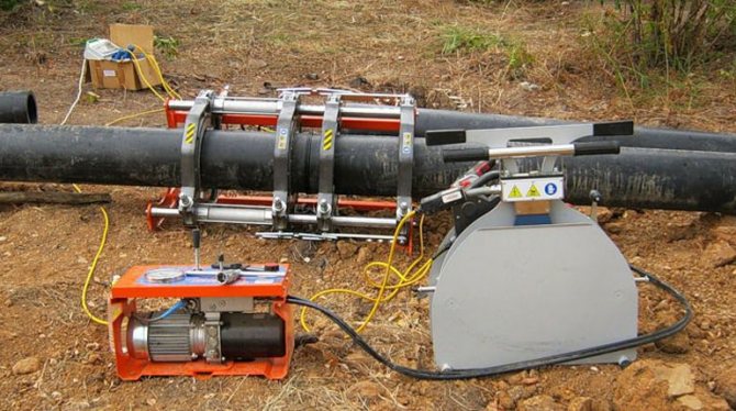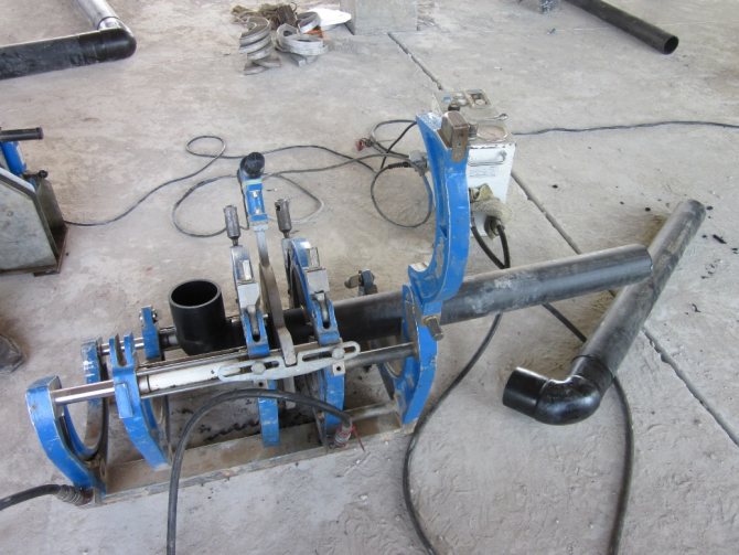Le soudage bout à bout de tuyaux PE dans des conditions industrielles est effectué par une machine coûteuse et encombrante à entraînement mécanique ou hydraulique. L'ensemble du dispositif comprend des guides pour le centrage, une tondeuse pour la coupe en douceur des bords en butée, un élément chauffant, des entraînements et des minuteries. La technologie de bout en bout elle-même est simple, mais l'équipement utilisé n'est pas bon marché: le prix d'une machine à souder pour les tuyaux en PEHD est en moyenne de 250 000 roubles et un élément chauffant séparé coûte environ 50 000 roubles.