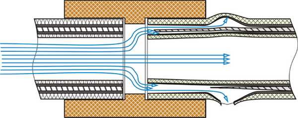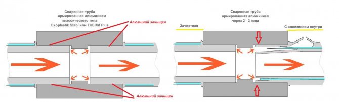 Lors de l'utilisation de tuyaux dans lesquels la couche d'aluminium est au milieu, il n'est pas nécessaire de décaper, mais de couper. Pour cela, un dispositif spécial est également utilisé, mais d'un plan différent - il coupe la feuille à l'intérieur du tuyau de plusieurs millimètres sans détruire les couches de polypropylène. Cette procédure est plus simple et plus rapide (les vendeurs appellent ces tuyaux "paresseux", vous comprenez pourquoi?). En principe, si le joint est fait correctement et correctement, le polypropylène est soudé l'un à l'autre, alors un tel joint est plus ou moins fiable. Mais s'il y a un micropore, l'eau y pénètre et provoque une délamination des tuyaux. Et la présence de micropores est garantie avec une coupe verticale insuffisante, une expérience insuffisante (exposition incorrecte lors du soudage) et un retrait incomplet de la feuille, et il n'est pas réaliste de contrôler avec quelle précision la feuille est enlevée entre les couches de polymère ... Tout cela est lourd. avec des ruptures, des fuites et une violation de l'intégrité du système. Comment ils sont formés est montré dans la figure ci-dessous.