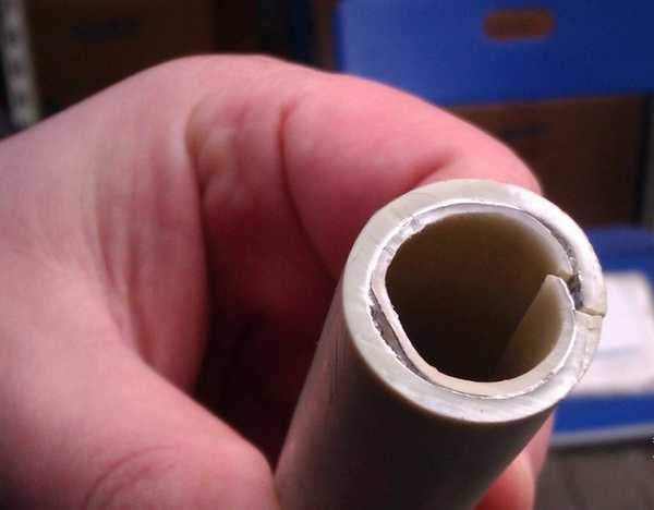 Dans le même temps, le polypropylène et l'aluminium sont trop différents les uns des autres en termes de structure moléculaire, par conséquent, leur connexion n'est pas aussi fiable. Une coupe d'un tuyau avec renfort en aluminium est un sandwich de deux couches de PPR, entre lesquelles une feuille est posée.