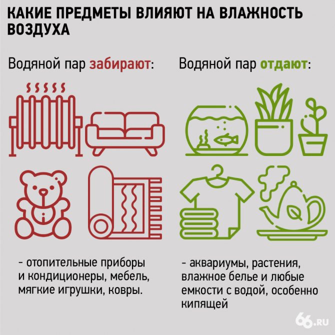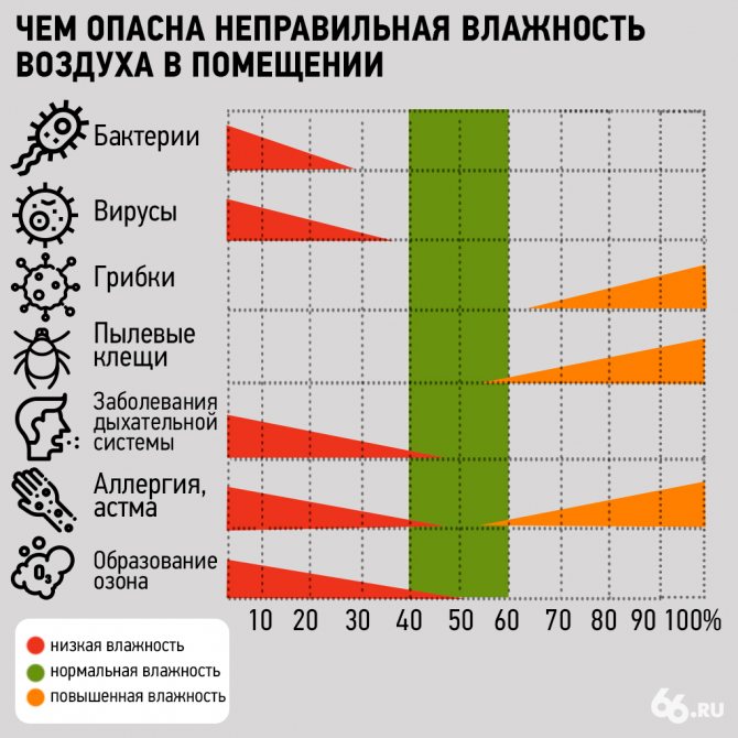 Haut conduit à l'apparition de condensation sur les fenêtres, rend l'atmosphère étouffante, rend la respiration difficile et donne l'impression d'être dans un bain. Une humidité élevée active les bactéries dangereuses, la moisissure, la moisissure et les acariens. Les allergies, les poussées d'asthme et d'autres maladies respiratoires peuvent également être une conséquence.