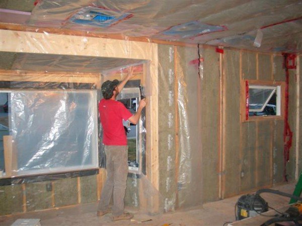 - À la suite de telles actions, l'humidité ne pourra pas se propager au-delà des limites de la surface endommagée. Lors de l'isolation des murs à l'intérieur du bâtiment, il est nécessaire de fabriquer un pare-vapeur qui isolera de manière fiable la zone réparée des vapeurs humides des flux d'air.