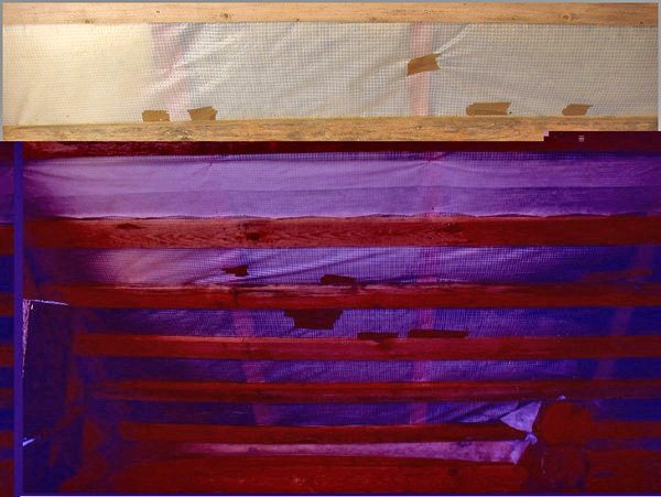 - À l'aide d'une agrafeuse de construction, des feuilles de penofol sont fixées aux poutres.