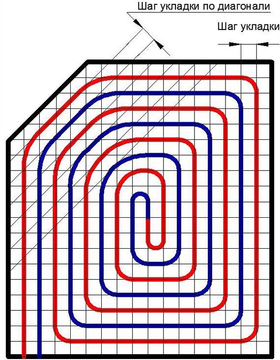 Il faut trancher. Il existe 2 options principales - serpent et escargot (spirale). De plus, sur papier millimétré, en tenant compte de la taille de la pièce à l'échelle, un schéma de la disposition des contours est établi. Les calculs devront probablement être effectués plusieurs fois. Par conséquent, dans le calcul des tuyaux pour le chauffage par le sol, un calculateur en ligne sera en mesure de fournir une aide précieuse.